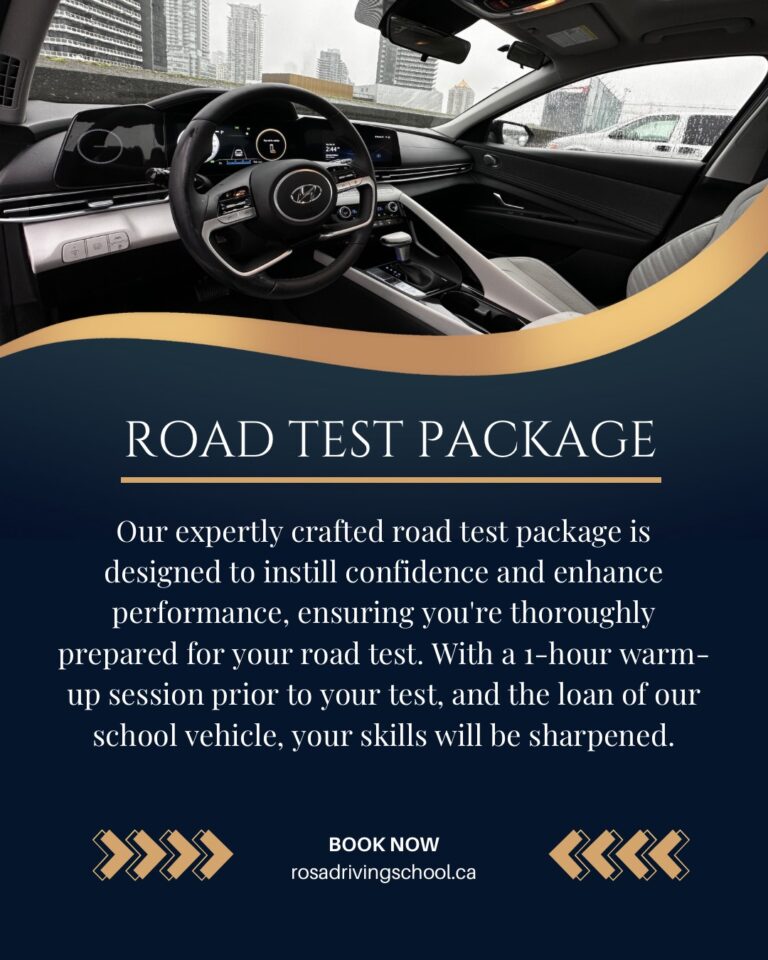 Rosa Driving School offers a one-hour-warm-up lesson and pre-trip inspection prior to your road test, including the school vehicle for your test.